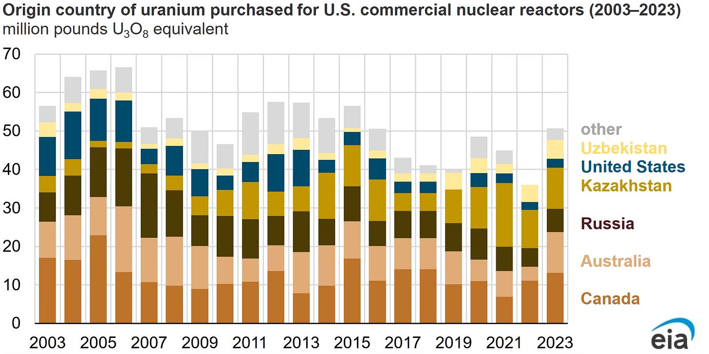 In 2023, the United States imported 99% of the uranium concentrate used for nuclear fuel. The two biggest origin countries were Canada and Australia—acceptable. The next three were Russia, Kazakhstan, and Uzbekistan. The United States banned imports of Russian uranium starting August 2024, but we left a waiver option open through the end of 2027. We had to.