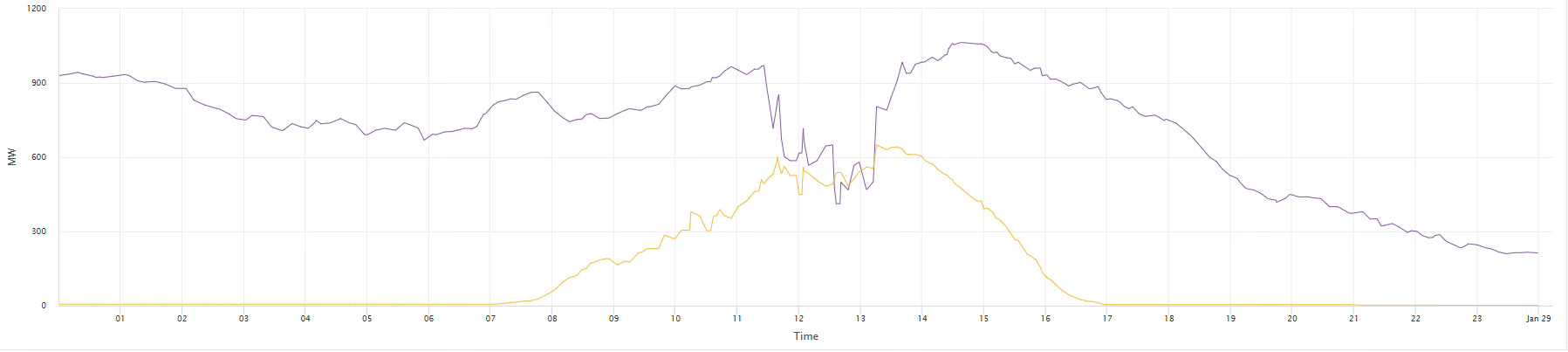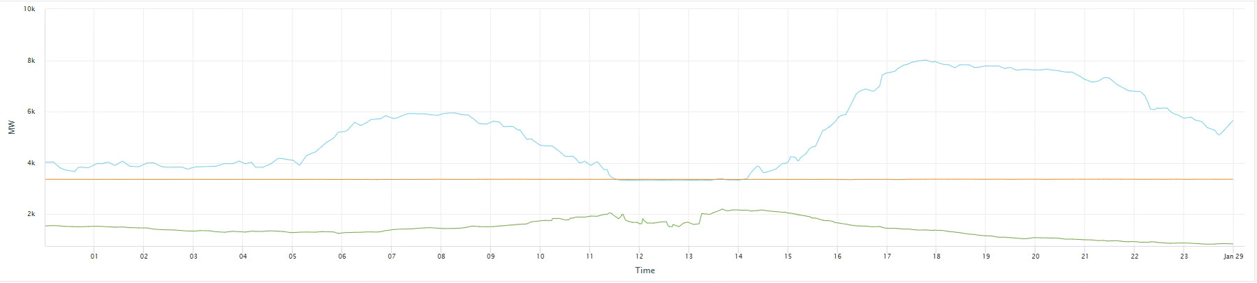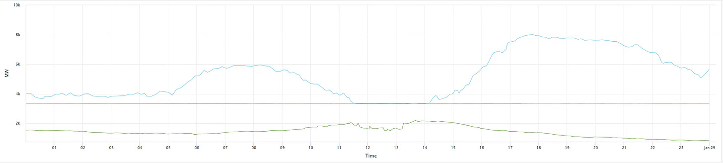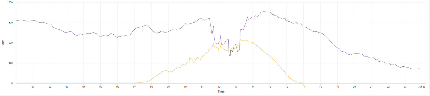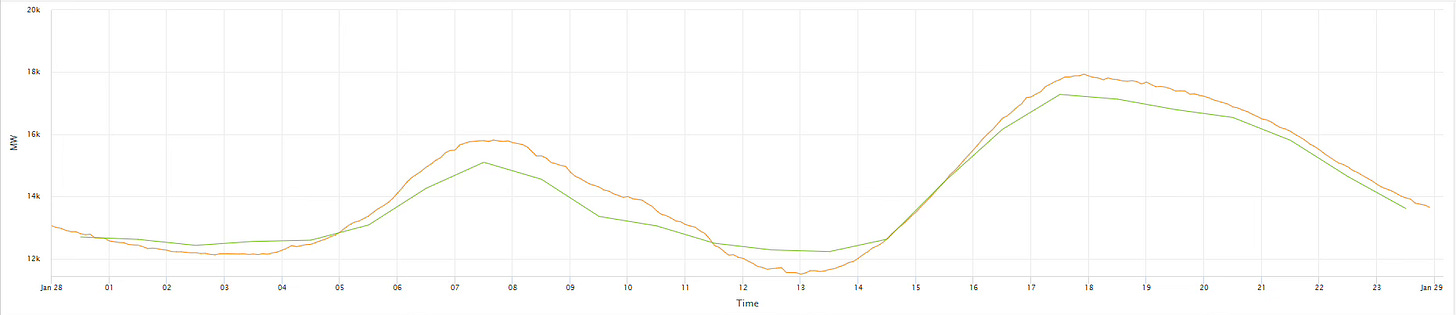 This was the ISO-NE system load on 28 January 2025. Green is what cleared on the day-ahead market at 10:30 AM on the prior day, and orange is what actually happened.2 Look at noon—demand fell below market expectations.