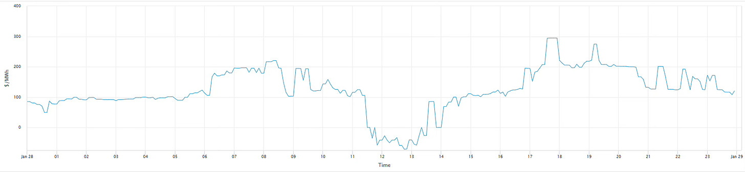 As behind-the-meter solar production pushed midday grid demand below forecasts, the spot price fell below zero. Between 11:30 AM and 1:30 PM, producers paid the grid to generate. That’s the wrong way round.