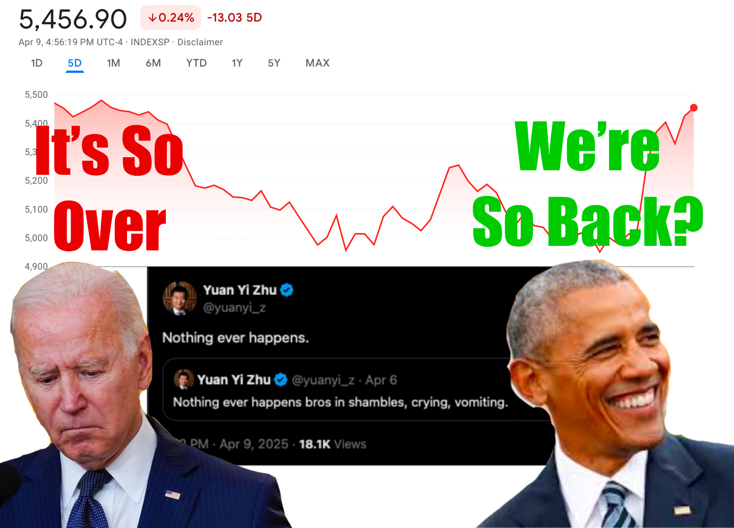 At midday yesterday, I checked my stock investments, which reflected a market reeling from Trump’s era-defining, history-book-warranting, likely-ChatGPT-derived Liberation Day tariffs. I’m still young, so the ominous red numbers are simply funny to me. So I texted a friend a three-month graph of the S&P 500: