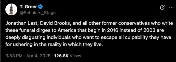 For some reason, Trump’s “reciprocal tariff” schedule was the Rubicon-crossing that convinced many people that The World Order Has Changed, and that the United States is no longer the paragon of the free world, or whatever.