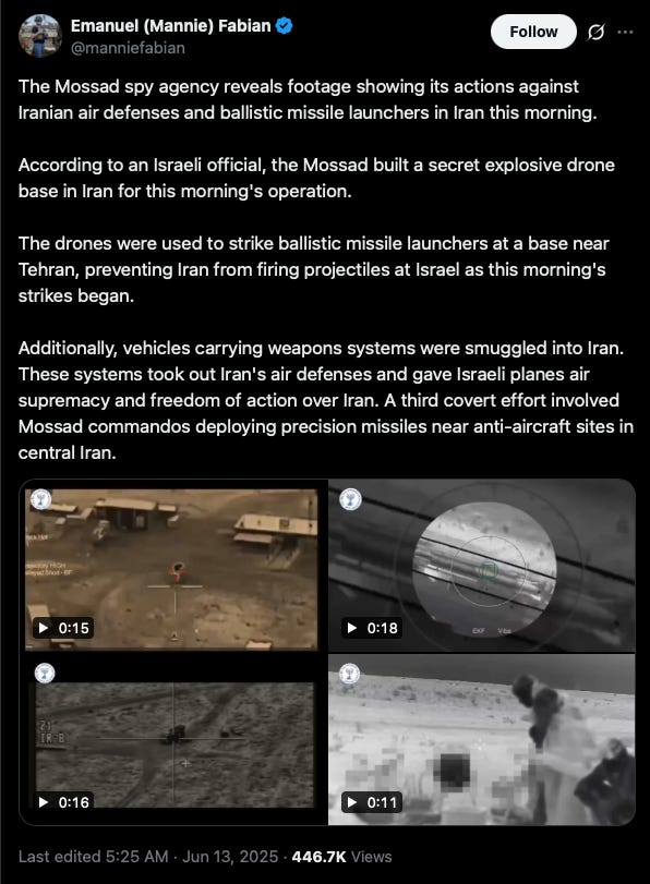 On 12 June 2025, literally eleven days later, Israel launched a shock-and-awe strike on Iranian targets—particularly nuclear research facilities and leadership in the Iran Revolutionary Guard Corps. This happened literally last night at time of writing, so details on the ground are scarce.