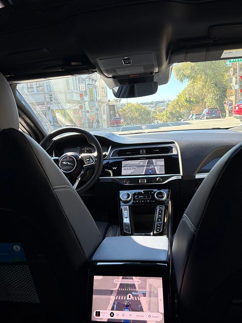 The Waymos are the best way to get around in San Francisco. The absence of a driver frees up the social energy I would have spent on even a quiet Uber ride, allowing me to let the “Chill Vibes” station play without prompting, catch up on my notifications, and zone out for twenty minutes. It’s cheaper than Ubers or Lyfts in Boston, and I’m never prompted to tip or rate a driver. The only technical problem is that Waymos struggle with finding elegant places to pull over. The primary social problem is that I learn a lot from talking to Uber and Lyft drivers.