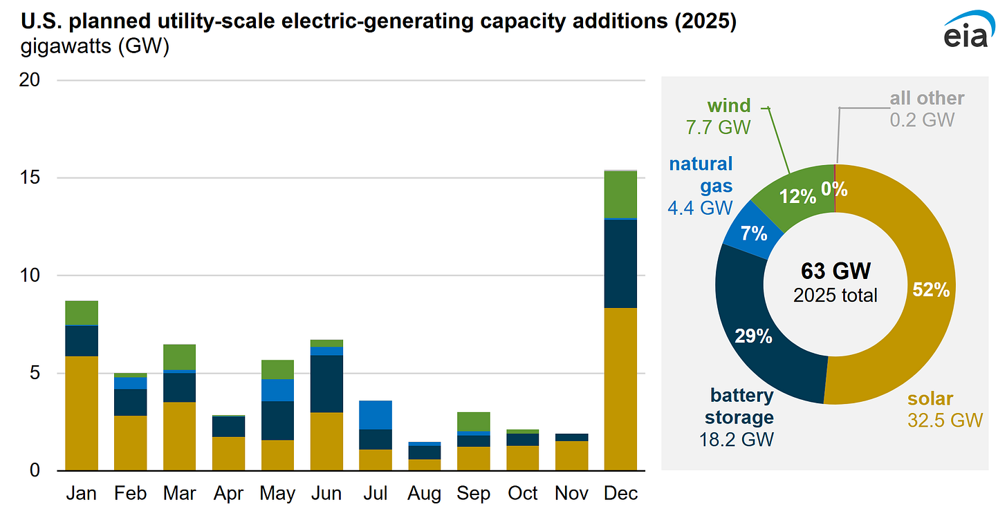 At the small scale, the municipal electric utility I work for could drop an RFP for 5 MW of grid storage tomorrow, and it could be powered up in 18 months. At the large scale, the EIA projects that half of the new capacity installed in 2025 will be solar, and almost a third will be battery energy storage.
