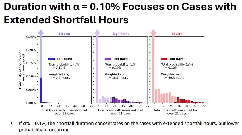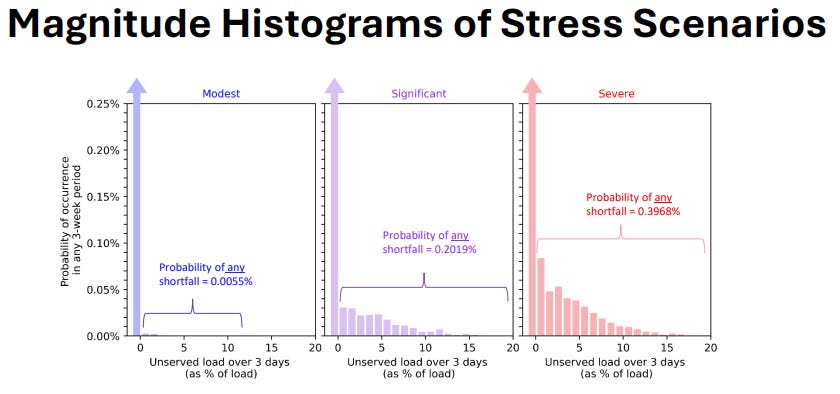 But saying there’s a 0.00001% chance of system collapse is a joke out of Jimmy Neutron. To model tail risks reasonably, you need to pick a real risk threshold—and in ISO-NE’s case, they pick a 0.25% risk of energy shortfall over a given 21-day window. This comes out to one shortfall per 90ish seasons, or one shortfall per 21 years. Of course, that risk of an energy shortfall is not evenly distributed—it’s almost certainly going to land on a cold, dark winter morning.