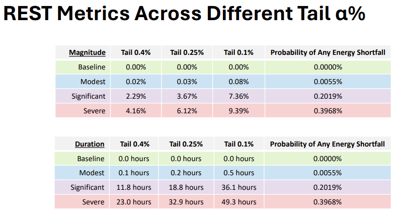 To this end, ISO-NE has two REST thresholds in mind: a magnitude-of-tail risk, and a duration-of-tail risk. As of April 2025, ISO-NE has come up with numbers for these risks at a variety of system stress levels. For the Winter of 2027, ISO-NE projects we’ll be okay, with: