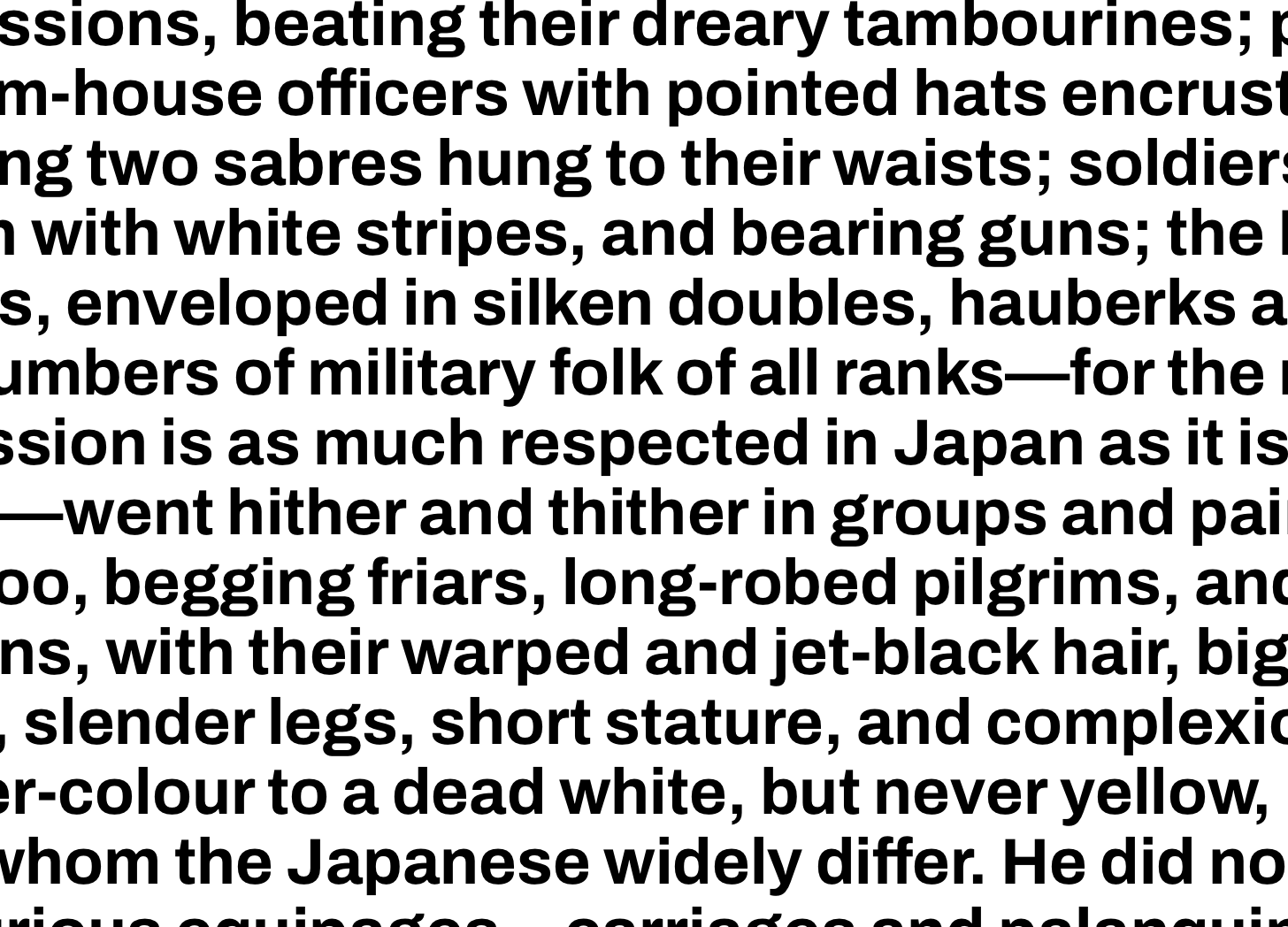 In the same manner as Apple’s San Francisco typeface, a Neo-Futurist typeface need not care about the physical realities of type. It is allowed to be fully digital, to shift and twist, to embrace dynamic italics for similar or swift sensations, to take on boldface for violent onomatopoeias, to deep-fry itself so that it can redouble the expressive force of words.