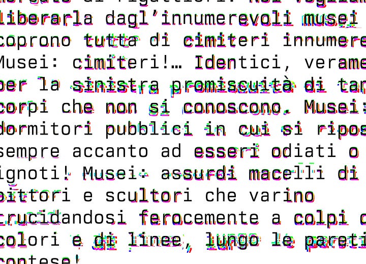 Of course, Marinetti was not only an Italian Futurist—he was an Italian Fascist, too. His enemies were not merely the Old Guard and its retrograde gatekeepers; he also named feminism, pacifism, and moralism as foes. I don’t necessarily consider this a reason to reject Futurism—in fact, the militaristic, authori-curious, lǎo dēng 老登 flavor of Futurism fits well with this new right. I personally find Futurism inherently exciting, and if nothing else, I resent seeking political coalition with people who have wack taste in art. I insist on better typography out of personal honor.
