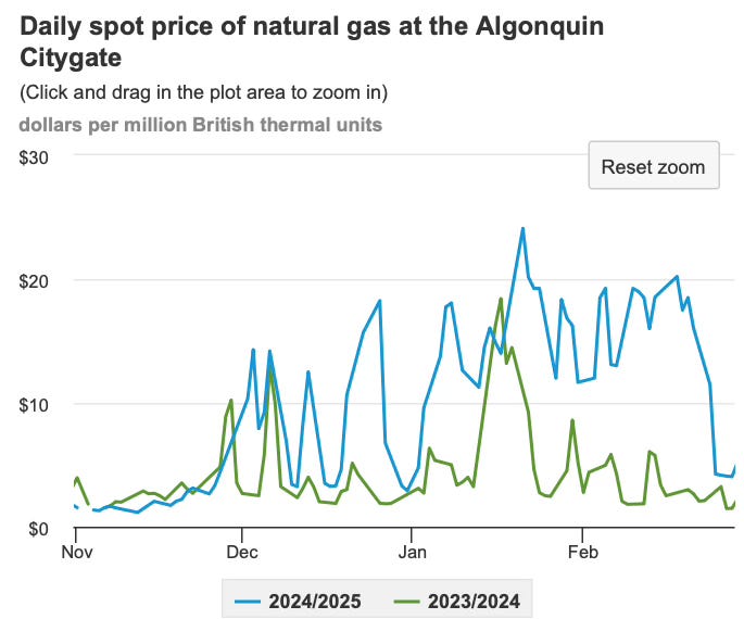 Peep this graph of wholesale natural gas prices at the Boston hub. Green was the Winter of ‘23-’24. Blue was this past winter: