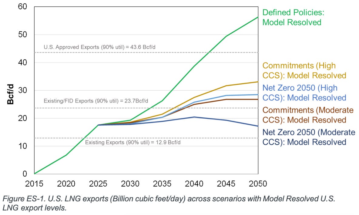 The United States will continue to export a lot of LNG with existing export terminals and currently-under-construction export terminals. Granholm et al. argue that unless the world collectively breaks its climate promises at scale, Baseline Export capacity will be enough for global demand.