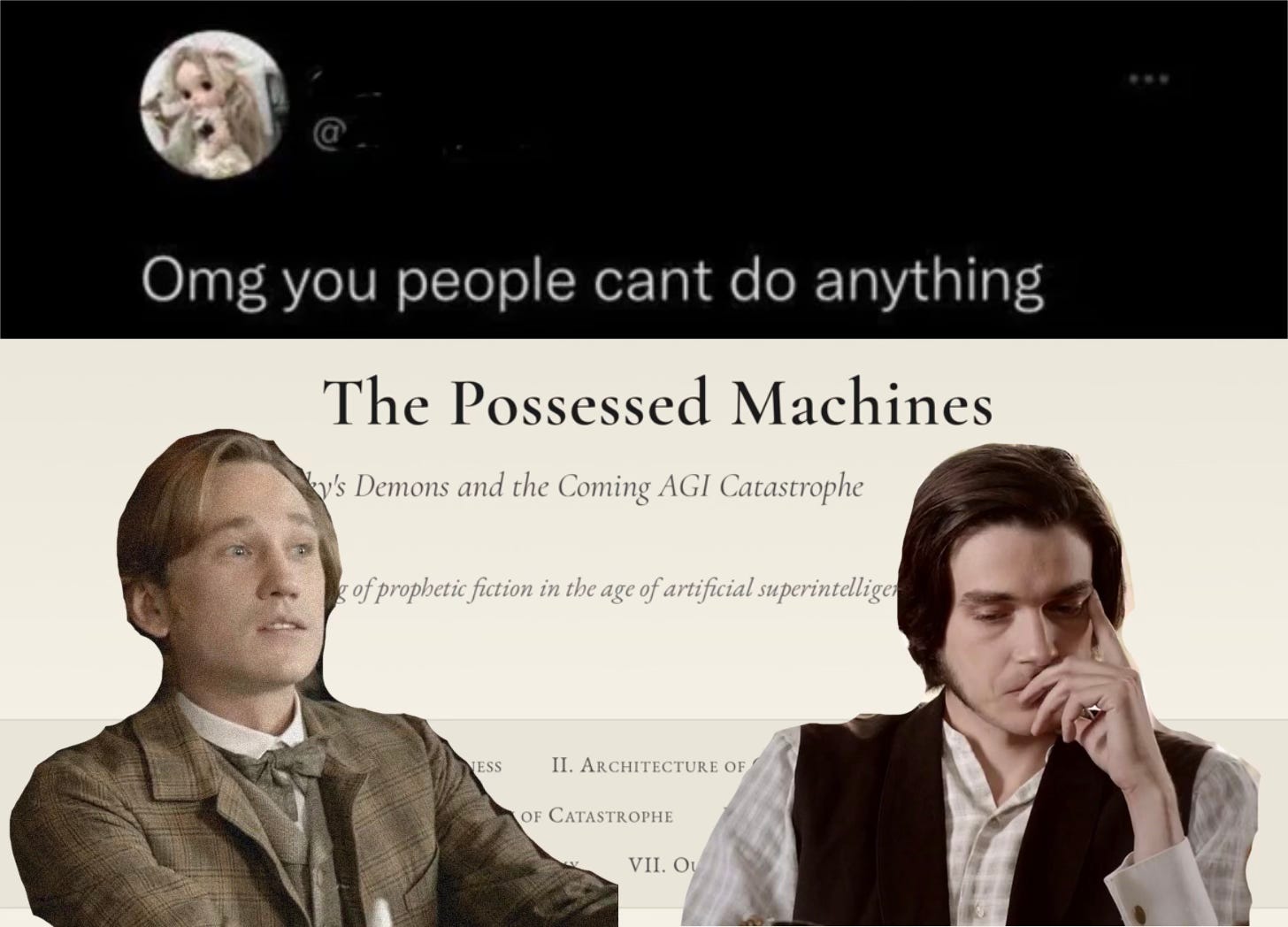 But that house only needed two guys to start the chain reaction. And the AI engineers that motivated “Possessed Machines” are much more competent conduits for national destruction than the group of five in Demons.
