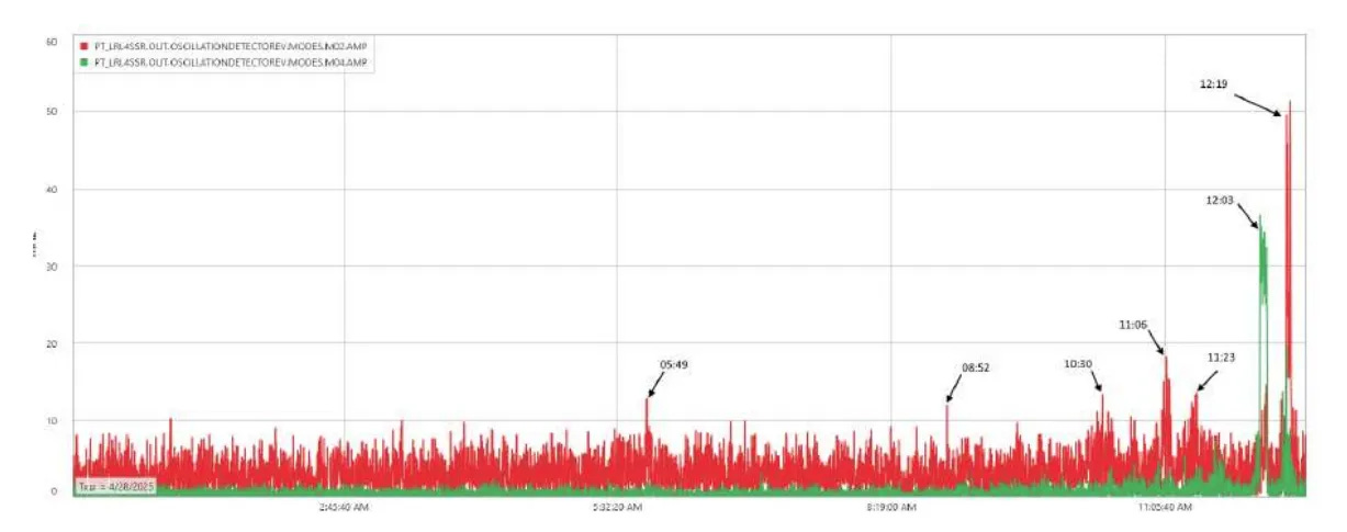 At 12:32 PM, systemwide voltage starts to climb. The report isn’t clear on why, but it might be related to falling power exports from Spain to France. I don’t think the frequency oscillations from the morning caused this, but grid operators did reduce exports to damp those oscillations. And all over the Spanish system, generators start clicking offline.