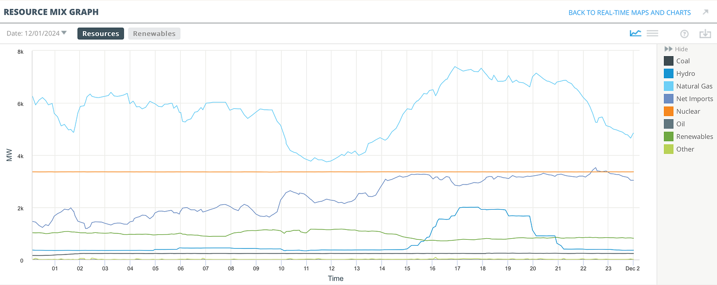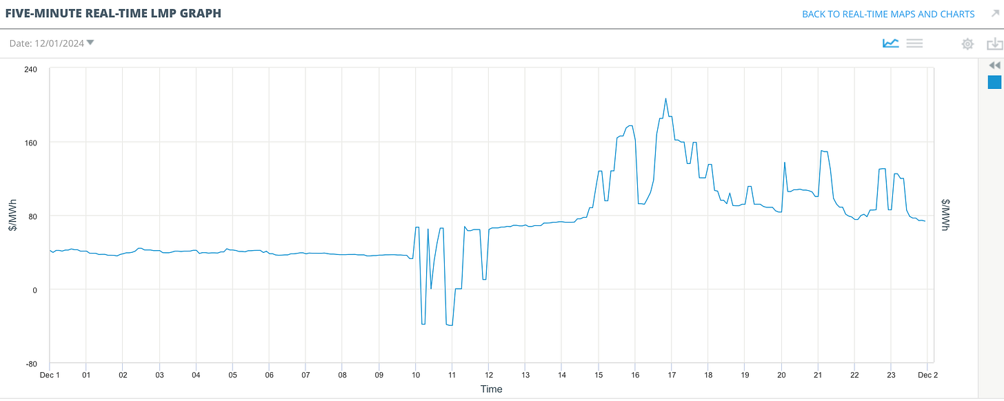 December 2024 started strangely on the ISO New England spot market. The morning trundled along normally, but between 10 AM and noon, the local marginal price (LMP) started ping-ponging between $65/MWh and negative $35/MWh as natural gas generation plummeted, balanced partially by import electricity and partially from a midday fall in demand.