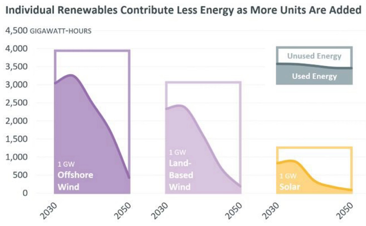 This suggests deploying energy storage to fill in those gaps. However, even the value of four- and eight-hour energy storage will start to fall as those “marginal” hours also get saturated, leaving only that last 25%, then 10%, then 5% of hours of the weakest intermittent generation chasing the most demand.